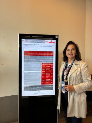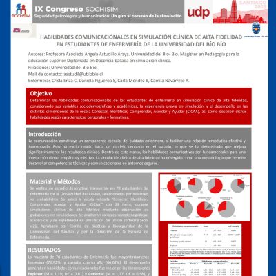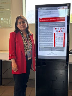 También desde Enfermería, la Mg. Ángela Astudillo Araya presentó el póster “Habilidades comunicacionales en simulación clínica de alta fidelidad en estudiantes de enfermería de la UBB”, investigación que se vincula directamente con uno de los pilares del cuidado enfermero: la comunicación como base de una relación terapéutica efectiva, humana y centrada en el paciente. “La enfermería es una profesión que mantiene un contacto permanente con las personas, por eso la comunicación no puede quedar al azar; debe enseñarse, entrenarse y evaluarse”, señaló Astudillo. Su trabajo aborda cómo la simulación clínica de alta fidelidad permite practicar estas habilidades en un entorno seguro, reproduciendo situaciones complejas que exigen claridad, sensibilidad y adaptación del mensaje.