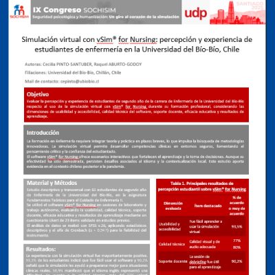 Desde el Departamento de Enfermería, la académica la Mg. Cecilia Pinto Santuber expuso la investigación “Simulación virtual: Percepción y experiencias de estudiantes de Enfermería en la Universidad del Bío-Bío”, que analiza el aporte de herramientas digitales al desarrollo de competencias clínicas. Su estudio obtuvo el Primer Lugar en la categoría Póster de Innovación, destacando el valor pedagógico de la propuesta. “La simulación virtual complementa los escenarios clínicos presenciales y amplía las posibilidades de aprendizaje accesible y significativo para los estudiantes”, comentó Pinto.