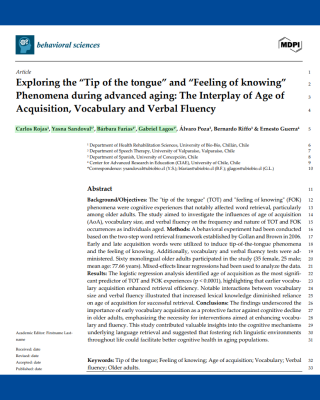 La Facultad de Ciencias de la Salud de la Universidad del Bío-Bío se enorgullece en anunciar la reciente publicación del académico Dr. Carlos Rojas, junto a las y los investigadores Mg. Yasna Sandoval, Mg. Bárbara Farías y Mg. Gabriel Lagos -pertenecientes al Departamento de Ciencias de la Rehabilitación en Salud- en la prestigiosa revista Behavioral Sciences. Su artículo titulado “Exploring the ‘Tip of the Tongue’ and ‘Feeling of Knowing’ Phenomena during Advanced Aging: The Interplay of Age of Acquisition, Vocabulary, and Verbal Fluency” (Explorando la ‘punta de la lengua’ y la ‘sensación de saber’ durante el envejecimiento avanzado: La interacción entre la adquisición a los 3 años, el vocabulario y la fluidez verbal), aporta nuevos conocimientos sobre los fenómenos lingüísticos que afectan la memoria y el lenguaje en los adultos mayores.