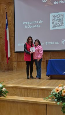 A lo largo de la jornada, se rindió un emotivo homenaje a la Agrupación Renacer Santa Águeda, por su valiosa labor de apoyo a mujeres que enfrentan el cáncer de mama. Edith Utreras, representante de la agrupación, entregó material autobiográfico desarrollado por mujeres que han vivido esta enfermedad, material que fue donado a la Biblioteca UBB como un acto de visibilidad y apoyo a quienes transitan por el camino del cáncer.